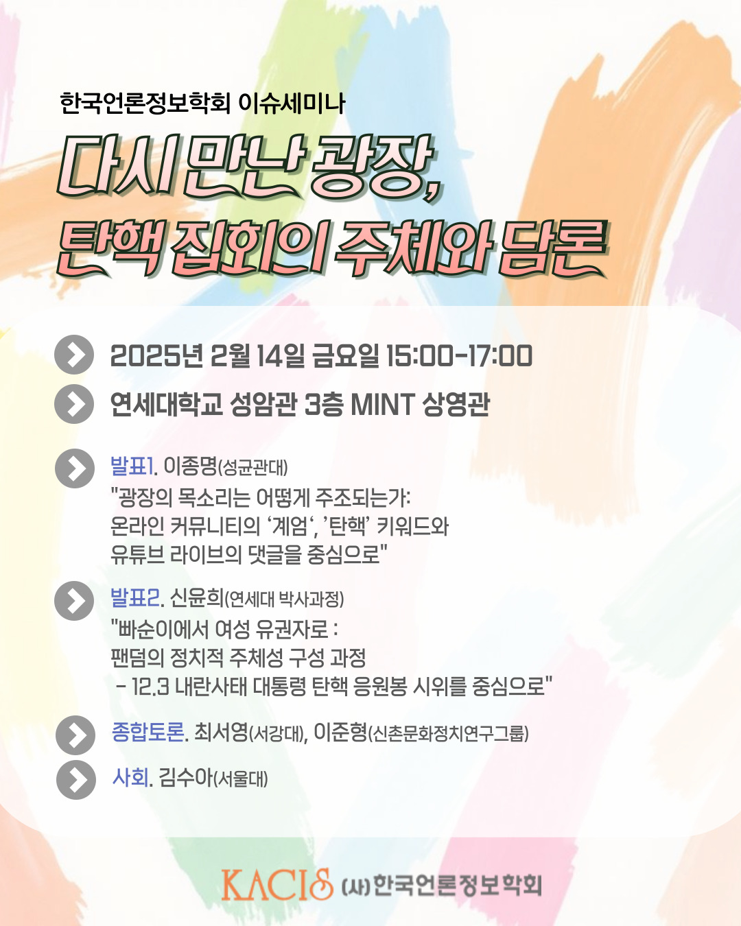 2. 한국언론정보학회는 오는 2월 14일(금요일) 이슈세미나 "다시 만난 광장, 탄핵 집회의 주체와 담론"을 개최합니다. 세미나와 관련한 내용을 다음과 같이 공지합니다. 회원 여러분의 많은 관심과 참여를 부탁드립니다.