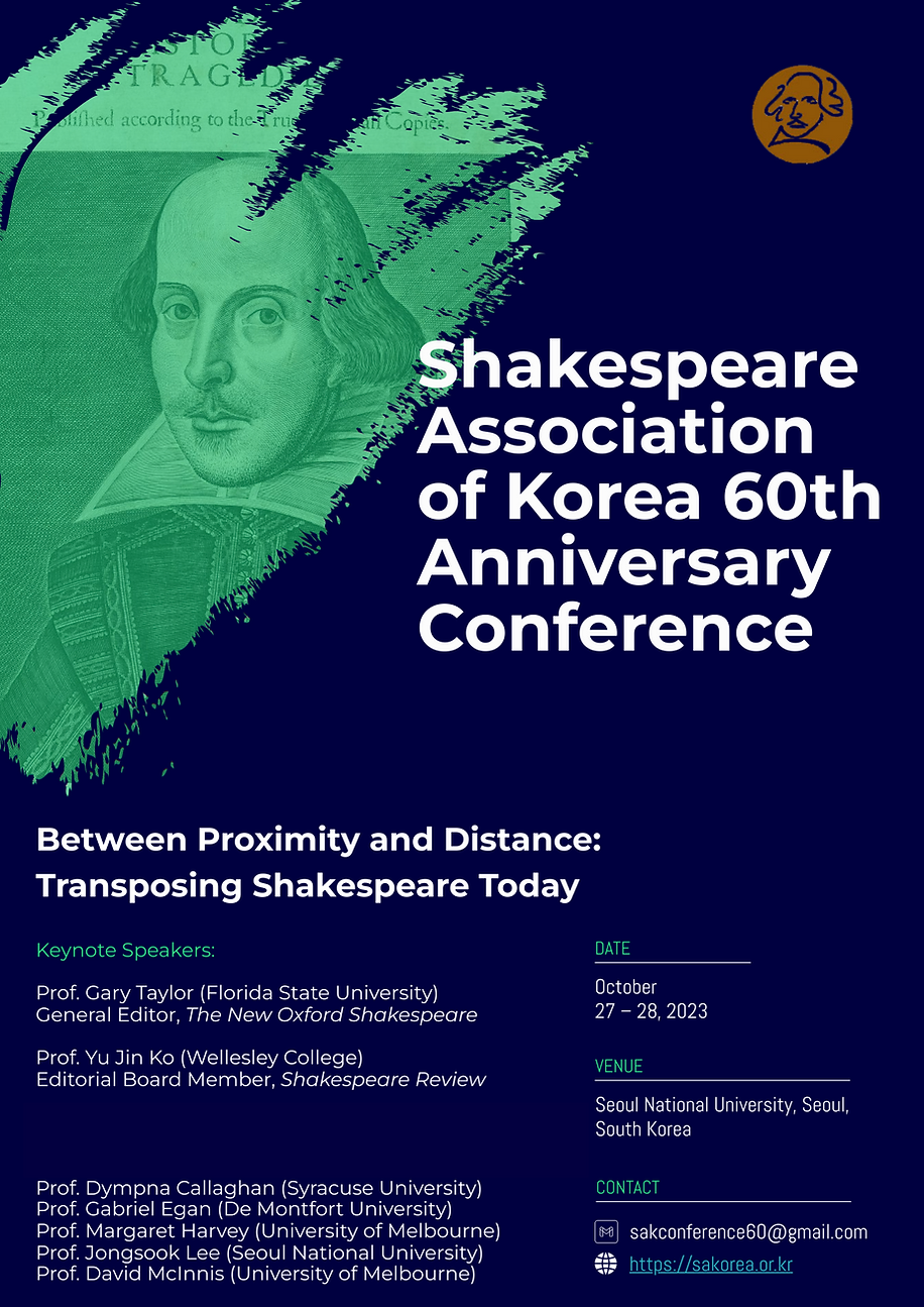 올해 10월 27일(금)-28일(토) 서울대학교에서 열리는 SAK 60주년 기념 국제학술대회: 'Between Proximity and Distance: Transposing Shakespeare Today' 가 이제 얼마 남지 않았습니다. 이번 국제학술대회에 대한 최근까지의 진행상황을 알려드리고자 합니다.
