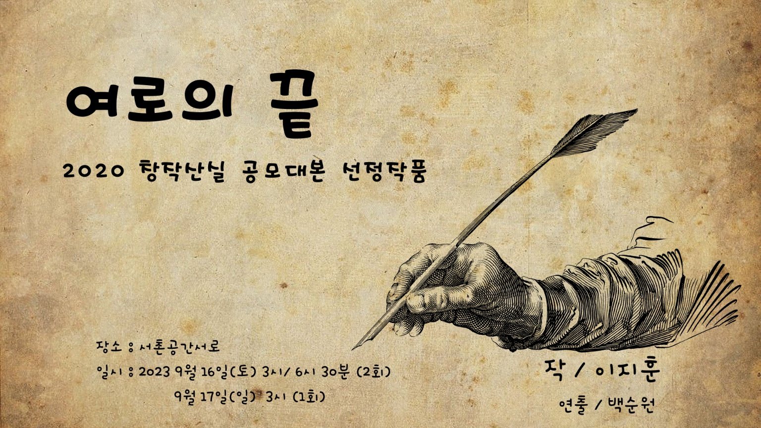 날짜: 9월 16일 (3시, 6시 반), 17일 (3시) - 3회 공연, 마지막 공연 후 작가, 배우와의 대화