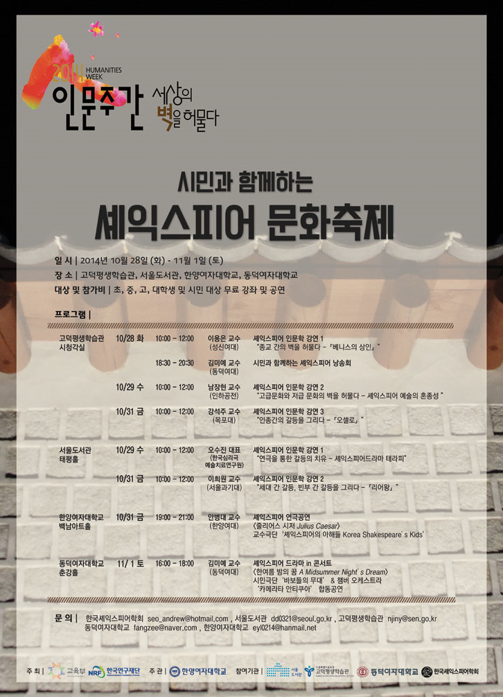 학회는 인문주간(2014. 10. 28~11.1)동안 “인문학, 벽을 허물다”라는 주제로 젠더의 벽, 종교의 벽, 고급문화와 저급문화의 벽, 세대 간의 벽, 빈부 간의 벽, 인종 간의 벽 등을 극복하는 주제의 셰익스피어 작품 강연 및 문화행사를 주관합니다. 지도하시는 학생들에게 홍보해 주시고 적극적인 관심과 참여 당부 드립니다.