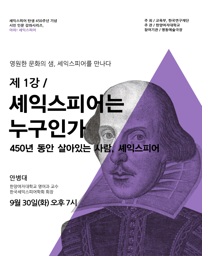 1년차는 시민들과 셰익스피어의 대표작품들을 함께 읽어가며 이해를 돕는 강좌, 2년차에는 셰익스피어를 차용한 미술, 음악 등 어려 예술적 재편들을 동해 문화 콘텐츠로서 셰익스피어의 가치를 시민들에게 전달하도록 기획하고 있습니다. 이번 인문강좌사업은 다가 올 또 다른 50년을 준비하여 학회는 학술연구는 물론, 공연, 미디어, 출판 및 교육 등에서 셰익스피어의 대중화를 통해 학회의 내실화 및 미래를 위한 새로운 도약을 추구하는 첫 발걸음이 될 것이니 모든 회원님의 관심과 지원을 다시 한 번 부탁드립니다. 그 첫 번째 강의가 이번 9월30일(화) 오후 7시 명동예술극장에서 “셰익스피어는 누구인가”의 주제로 진행됩니다. 명동예술극장은 약 300명 수용이 가능한 공간이므로 학회회원은 물론, 지도하시는 학생들 그리고 주변 분들에게 적극 홍보해 주시어 학회에서 진행하는 본 강좌들이 성황리에 치러질 수 있도록 협조를 부탁드립니다.