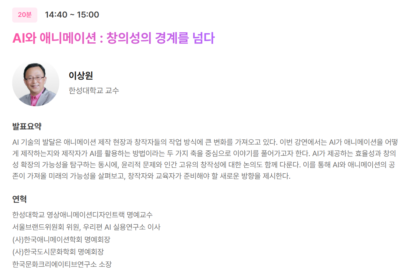 *이상원 명예회장님 발표: (29/금 14:40-15:00) 문화콘텐츠 분야-AI와 애니메이션 부문, 'AI와 애니메이션:창의성의 경계를 넘다'